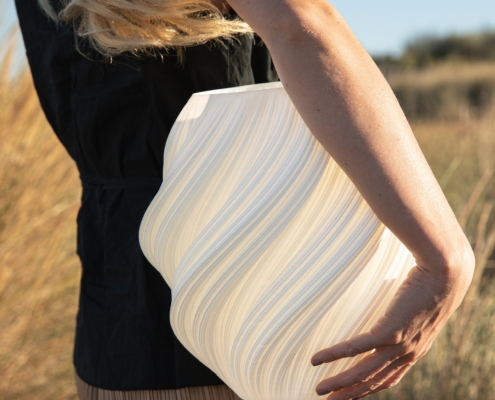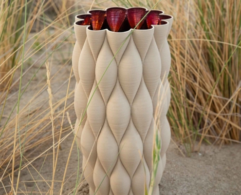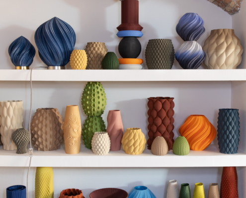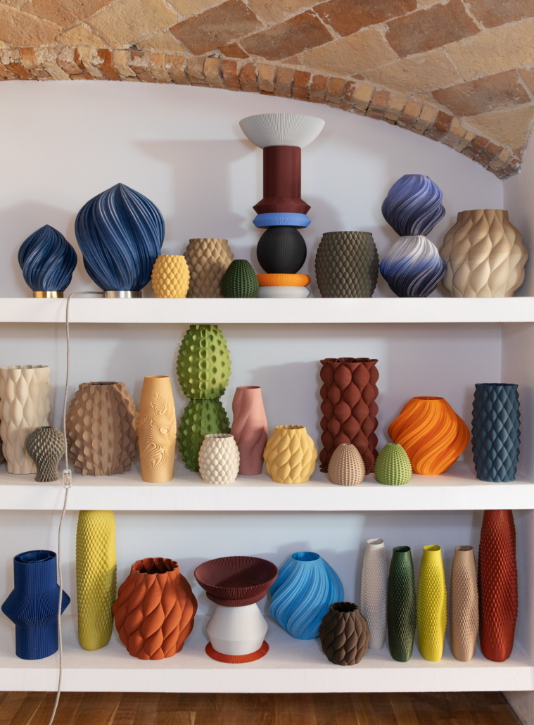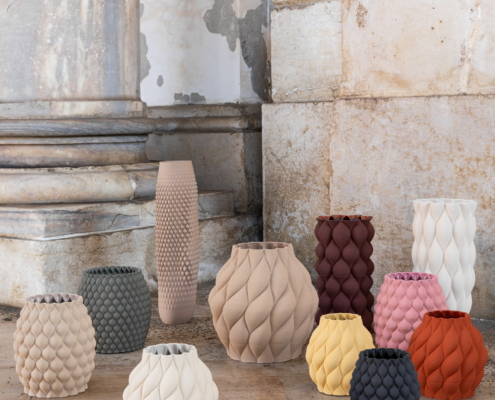 Abandoning traditional craftsmanship, it explores new shapes, textures, and scales—creating sculptural “towers” born from spontaneous design and digital fabrication.