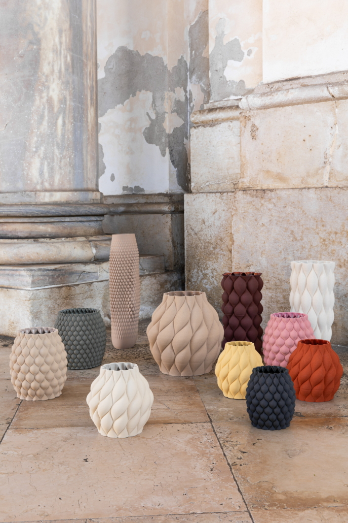 Crafted from PLA, a bioplastic from renewable sources like corn, these vases are colored using seasonal agricultural waste: tomato peels (red), aromatic herbs (green), rice (white), willow wood (yellow), and ebony wood (black).