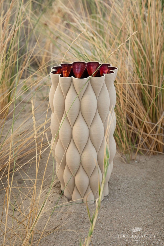 Each vase is hand-kneaded, pigmented for a raw, earthy finish, shaped via 3D printing, and kiln-fired twice.